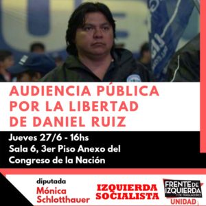 “A prisão de Ruiz é parte da politica repressiva e de criminalização da lutas feita pelo governo Macri e Patricia Bullrich. O roubo aos aposentados votado pelo governo nacional e o peronismo no senado em 2017 é o que exige o FMI. Exigimos a imediata liberdade de Ruiz e chamamos a redobrar a campanha para conseguir esse objetivo“, afirmou a ferroviária e Deputada da FIT, Mónica Schlotthauer (Dirigente da Esquerda Socialista).