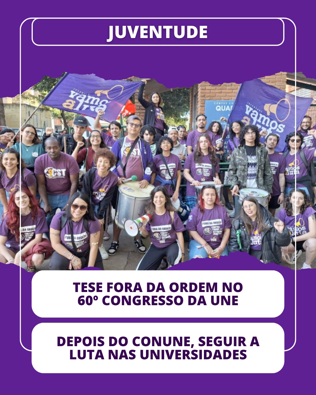 De 16 a 20/07 ocorreu o 60º Congresso da UNE. A Juventude Vamos à Luta esteve com a tese “Fora da Ordem: contra Trump e a extrema-direita”, batalhando pela unidade da oposição contra a direção majoritária. Propusemos um calendário de lutas para 11/08 contra o imperialismo de Trump, em defesa da Palestina, contra o arcabouço fiscal e plano safra de Lula/Alckmin.