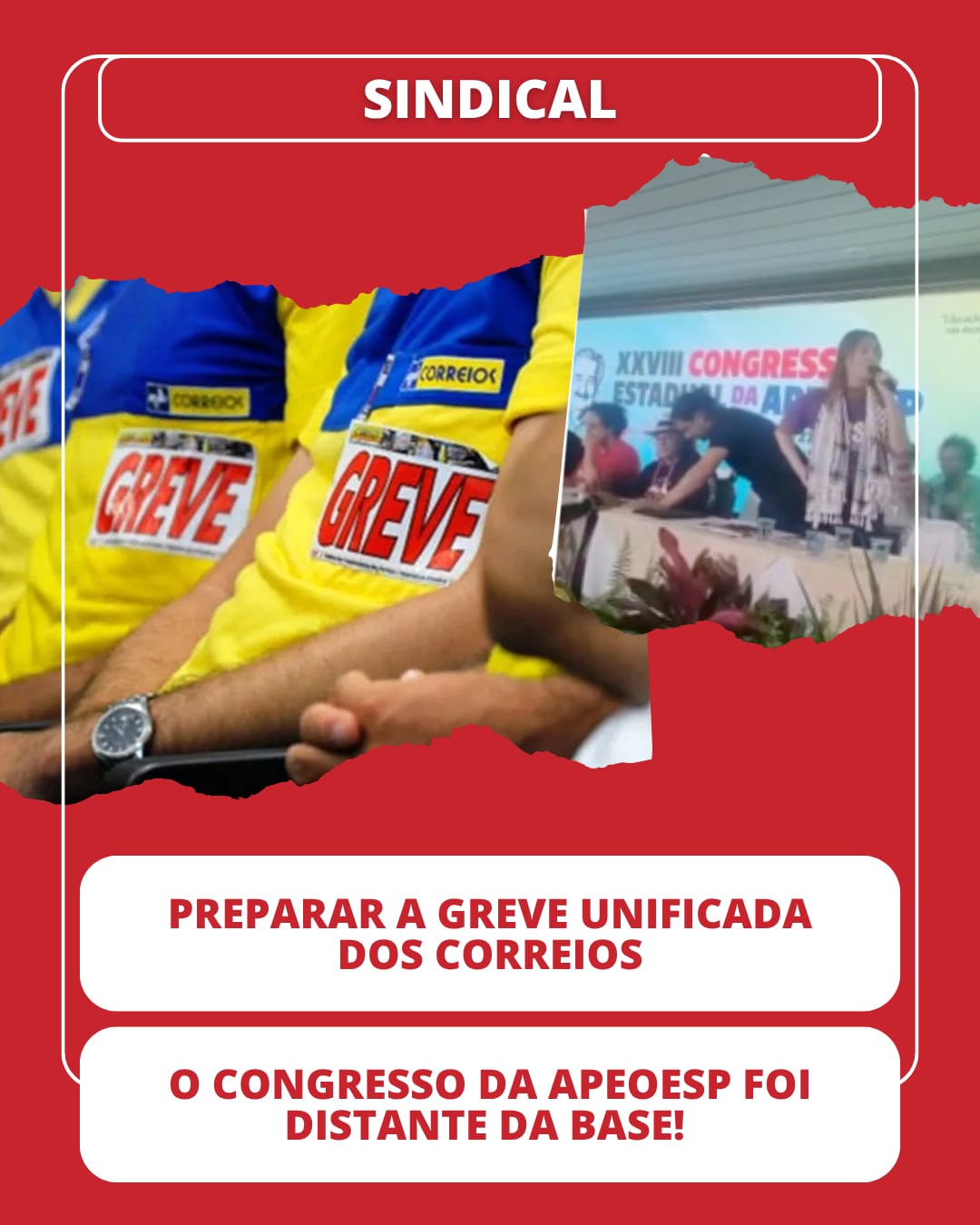 Precisamos pressionar pela base para que essas direções convoquem assembleias em todo país e aprovem um um indicativo de greve para o dia 30/10 construindo assim um movimento nacional para conquistar aumento real de salário, barrar a escala 12×36,pelo fim da mensalidade e redução da coparticipação no plano de saúde, contra o sucateamento da empresa, para exigir investimentos do governo Lula nos correios e contra a política de ajuste fiscal.