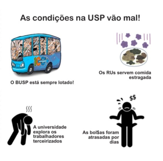A USP vem sofrendo um profundo desmonte às custas dos estudantes e de seus trabalhadores. O BUSP está sempre lotado, os RUs servem comida estragada e a universidade explora os terceirizados. Se você for bolsista aqui, nada de tranquilidade na “melhor do BR”, pois o CRUSP ficou sem água e as bolsas foram atrasadas por dias. O reitor Segurado opera esse desmonte arrochando os salários dos trabalhadores e ampliando as terceirizações; não libera o BUSP para os terceirizados e, junto a isso, busca o fim das entidades estudantis e de sua autonomia. Em unidade com Tarcísio, a política da reitoria prioriza os docentes na bonificação e nega a reivindicação salarial dos técnicos, numa evidente tentativa de rivalizar as duas categorias. Para nós, a saída é a unidade em defesa dos direitos dos trabalhadores e estudantes. Chega de desmonte, ao mesmo tempo em que a universidade acumula bilhões em reservas!